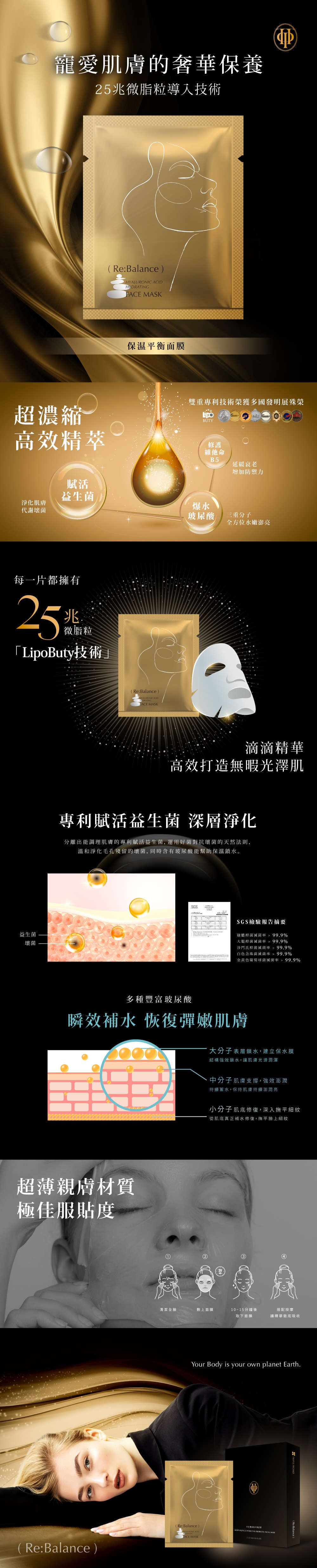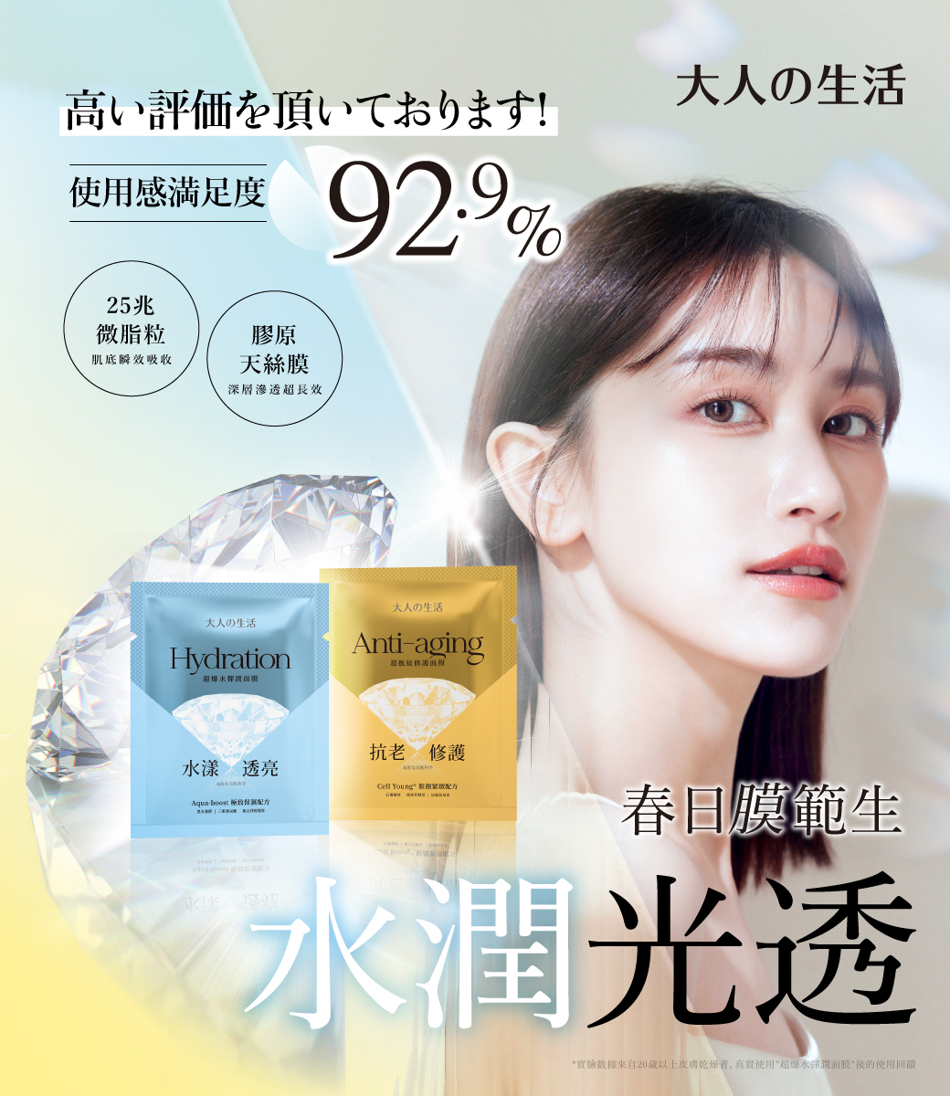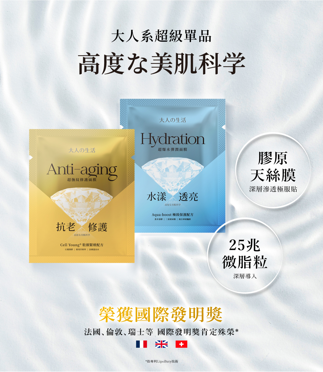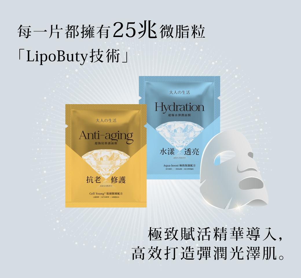 每片面膜皆含有25兆微脂粒LipoButy技術,精準導入精華直達肌底,為肌膚提供深層滋潤,更讓您的肌膚在大人的生活中綻放光彩!
